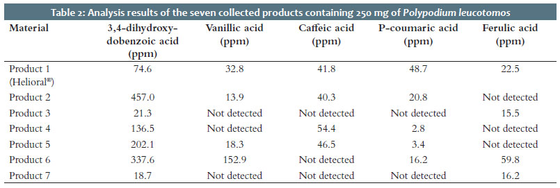 Seven products containing 250 mg of Polypodium leucotomos were analyzed. One product was Helioral®, composed of the standardized extract Fernblock®, commercially available in several countries worldwide, and six other products from different compounding pharmacies. Table 2 lists the results of the analysis.