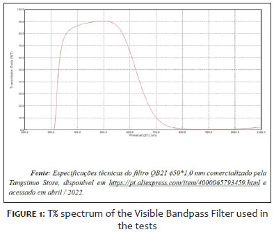 O espectro de transmissão dos filtros encontram-se reproduzidos nas figuras a seguir e foram confirmados por meio de medição de T% por espectrofotômetro da marca Thermo Scientific, modelo Genesys 10S UV-Vis, em mode scan de 400 a 1100nm com passos de 1nm (Figuras 1 e 2).