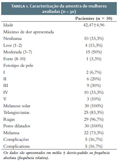 A amostra consistiu em 30 pacientes do sexo feminino, com idades variando entre 33 e 52 anos (média de 42,47±4,96). Os fototipos de pele III e IV foram os mais frequentes, estando presentes todos os fototipos de pele, de I a V. Todas as pacientes apresentavam melanose e poros dilatados, e a maioria tinha rugas (96,7%), telangiectasias (83,3%) e melasma (73,3%) (Tabela 1).