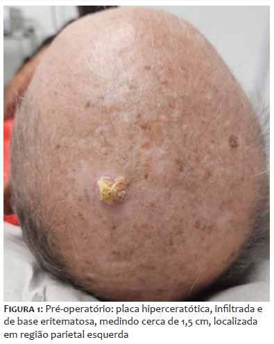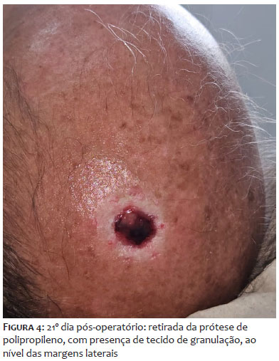 O paciente, um homem de 73 anos, portador de esclerodermia sistêmica limitada, relatava presença de lesão dolorosa em couro cabeludo há seis meses. Ao exame físico, a lesão apresentava-se como um nódulo hiperceratótico infiltrado e de base eritematosa (Figura 1), com 1,5 cm em seu maior eixo e localizado em região parietal esquerda. O nódulo era compatível com a suspeita de carcinoma espinocelular (CEC). Optou-se pela excisão com margem oncológica e fechamento por segunda intenção com o uso da técnica de Figueiredo para a abordagem cirúrgica terapêutica, por se tratar de um ambiente ambulatorial de média complexidade. Foi realizada antissepsia com clorexidina alcóolica e anestesia local infiltrativa com lidocaína 2% com vasoconstritor. A exérese da lesão englobou uma margem lateral de 4 mm, chegando-se à gálea no limite inferior (Figura 2). Foi feito o recorte da bolsa de soro fisiológico e colocação da prótese de polipropileno, mantendo dimensões similares ao defeito cirúrgico (Figura 3). Para evitar isquemia do tecido , a prótese foi fixada com pontos simples de nylon 3.0 bem espaçados entre si. Um curativo compressivo foi realizado com gaze, faixa e fita Micropore. O paciente foi orientado a retirar os curativos secundários 48 horas após o procedimento e a retornar em 21 dias para a retirada da prótese. Passados 21 dias, o paciente retornou para a retirada da prótese. A área apresentava um tecido de granulação eritematoso e viável, ao nível da pele circunjacente. Não houve necessidade de desbridamento (Figura 4). O paciente evoluiu bem e sem queixas, retornou após 45 dias com cicatrização completa do defeito cirúrgico, referida desde o 30º dia. O laudo do exame histopatológico foi de CEC bem diferenciado, exérese com margens livres. O resultado estético satisfatório pode ser avaliado na Figura 5, após 6 meses do procedimento.