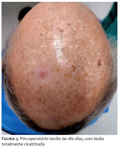 A técnica de Figueiredo apresenta-se como possibilidade para a condução de cicatrização em lesões estéreis em couro cabeludo. Considerada como de fácil execução, não necessita de cirurgião dermatológico com experiência em cirurgias avançadas ou centro cirúrgico de suporte em hospital terciário para ser realizada. Além disso, a técnica utiliza materiais de baixo custo e de ampla disponibilidade, o que desonera o sistema de saúde.2-6 Oncologicamente, permite a detecção precoce de recidivas e favorece a reintervenção, ao contrário da rotação de retalhos.6-8 Tem grande aplicabilidade em idosos, que apresentam redução do suprimento vascular, o que dificulta a pega do enxerto, como no caso da esclerose sistêmica. Também evita a abordagem de outra área cirúrgica (área doadora) nos casos de enxertia, reduzindo o incômodo, a probabilidade de complicações, o tempo de recuperação pós-cirurgia e a morbidade associada ao procedimento. Em casos de retalhos, também há a necessidade de ampliação da área cirúrgica para rotacioná-los, o que aumenta o tempo cirúrgico e a quantidade anestésica. Além disso, muitos pacientes apresentam áreas adjacentes ao tumor de pele abordado igualmente fotodanificadas, que não são ideais para a cobertura deste.2,4,5,6 Durante o processo de cicatrização, o exsudato formado é substituído por fibrina, que tem coloração amarelada. Gradativamente, esse tecido vai dando espaço ao tecido de granulação que, por fim, leva à epitelização completa da ferida operatória. Como a prótese de polipropileno é transparente, isso possibilita reavaliações, importante em casos nos quais as lesões são extensas e necessitam ficar com a prótese por um período maior do que relatado no presente caso. O tempo da cicatrização depende de fatores da ferida, como a ocorrência de infecção, e de fatores do paciente, como idade e qualidade da pele (espessura, vascularização, fotodano, etc.).3,4 Algumas publicações descrevem o processo de cicatrização por segunda intenção em feridas no couro cabeludo e na fronte após a realização da cirurgia micrográfica de Mohs.6,7 A cicatrização por segunda intenção se baseia em duas etapas principais: contração da ferida e reepitelização. Praticamente não há contração da ferida nas áreas citadas, dada a inelasticidade do tecido, de modo que a cicatrização ocorre predominantemente por reepitelização.7,8 O processo de reepitelização inicia nas margens da ferida. É preciso esperar que o tecido de granulação (TG) em formação "preencha a ferida", para que então ocorra a migração epitelial. A formação do TG depende da manutenção da umidade na ferida operatória (FO). A literatura descreve a limpeza da FO com peróxido de hidrogênio, o uso de antibióticos tópicos, limpezas diárias, uso diário de petrolato e a realização de curativos com quatro camadas (vaselina, gaze, algodão e fita) para evitar infecção secundária e permitir e formação do tecido de cicatrização. Também se propõe a realização de sutura em bolsa nas margens da ferida para acrescentar o componente de contração tecidual.7,8 O uso da prótese de polipropileno nas circunstâncias descritas neste relato de caso traz algumas vantagens. Ela é resistente, permanece sobre o local pelo período proposto, garante a proteção e a umidade do leito operatório, sem compressão e estimulando o tecido de granulação. Após o período inicial de 48 horas, curativos secundários e creme podem ser dispensados enquanto a bolsa estiver posicionada e o contato com a água é permitido. Além do mais, suturar as margens da lesão acrescenta o componente de contração tecidual descrito acima.2,3,4,7,8 É necessário realizar estudos prospectivos, randomizados e controlados com curativos convencionais para avaliar as potenciais vantagens da técnica de Figueiredo no reparo de defeitos cirúrgicos do couro cabeludo submetidos à cicatrização por segunda intenção.