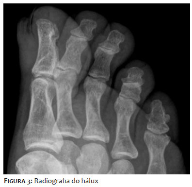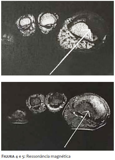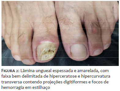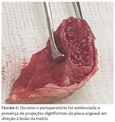 Paciente de sexo masculino, de 48 anos de idade, leucoderma, assistente de informática, compareceu ao serviço de Dermatologia se queixando de alteração da espessura e coloração da unha do hálux direito iniciadas há cerca de 15 anos, acompanhada por dor intensa há 1 ano, com piora progressiva e prejuízo da deambulação. Já havia realizado diversos tratamentos prévios para onicomicose com terbinafina oral e antifúngicos tópicos em outro serviço, sem melhora. Relatou episódios de agudização da dor com drenagem de secreção purulenta periungueal com necessidade de antibioticoterapia sistêmica em diversas ocasiões, além do uso frequente de anti-inflamatórios não esteroidais para alívio da dor. Ao exame dermatológico, o hálux direito apresentava lâmina ungueal espessada e amarelada, com faixa bem delimitada de hiperceratose e hipercurvatura transversa contendo projeções digitiformes e focos de hemorragia em estilhaço, melhor evidenciados à dermatoscopia. Havia também edema e calor da dobra ungueal proximal (Figuras 1 e 2). O exame micológico direto do leito ungueal apresentou resultado negativo, porém na cultura houve crescimento de Trichophyton mentagrophytes. Em radiografia de hálux direito (Figura 3), houve dúvida quanto à presença de lesão falangeana distal em saca-bocado em área subjacente à lesão ungueal. Foi solicitada ressonância magnética de hálux direito (Figuras 4 e 5), que evidenciou lesão ovalada em matriz, com hipossinal em T1 e sinal heterogêneo em T2, de limites imprecisos sem infiltração de partes moles, porém ocasionando remodelamento do contorno ósseo. Optou-se por abordagem cirúrgica com biópsia excisional de lesão para confirmação diagnóstica, sendo realizado bloqueio anestésico distal, descolamento da lâmina ungueal e exérese de lesão exofítica medindo 1,5 cm por 0,5 cm em matriz ungueal. No peroperatório foi evidenciada a presença de projeções digitiformes da placa ungueal em direção à lesão da matriz (Figura 6). A análise histopatológica, com coloração de hematoxilina eosina, evidenciou lâmina ungueal com cavitações preenchidas por plasma e tumor fibroepitelial com projeções digitiformes do epitélio matricial e alguns mastócitos de permeio, compatível com o diagnóstico de OM (Figuras 7 A, B).