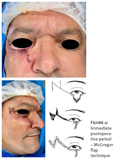 Surgical treatment was planned based on these findings. After lesion resection with a 5 mm safety margin, the surgical wound included the lower eyelid, leading to the choice of performing a McGregor flap reconstruction (Figure 3). The technique consists of a lateral incision following the curvature of the eyelid, which may extend to the area anterior to the preauricular hairline depending on the width of the defect to be covered. In the case of the patient in this report, extending the main incision was not necessary. The curvature of the incision is essential to provide adequate vertical length for the flap.