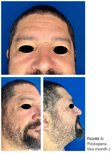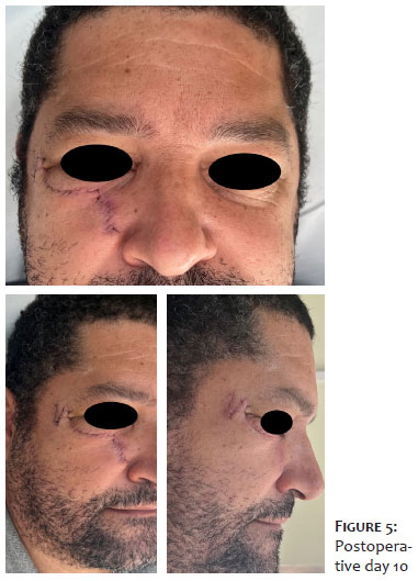 In 1973, McGregor introduced a technique to correct lower eyelid defects involving lateral periorbital Z-plasty, enabling medial advancement of the tissues and relieving tension on the advancement flap. This approach represents an excellent alternative within the reconstructive arsenal for complex lower eyelid defects. It was originally indicated for the reconstruction of V-shaped defects involving up to two-thirds of the eyelid width and is applicable to both the lower and upper eyelids. After 15 years applying this technique, McGregor reported favorable surgical outcomes, with high-quality scars and preservation of the natural appearance of the lateral canthus.12 In the present case, this technique was successfully used in the reconstruction of the lower eyelid and medial malar region, resulting in a satisfactory outcome and establishing itself as a valuable option within the surgical arsenal.