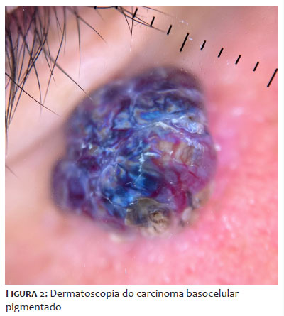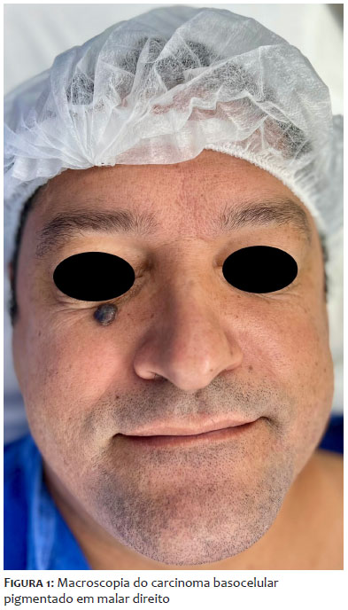 Paciente masculino, 47 anos, sem comorbidades e sem história pessoal ou familiar de neoplasia cutânea, foi encaminhado pela atenção primária devido a uma pápula pigmentada de aproximadamente 1 cm na região malar medial superior direita, com relato de crescimento rápido (Figura 1). A dermatoscopia da lesão revelou vasos arboriformes, padrão em arco-íris, ninhos ovoides azul-acinzentados e glóbulos azuis, achados compatíveis com CBC pigmentado (Figura 2), o que foi confirmado por biópsia incisional.