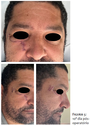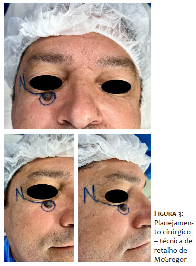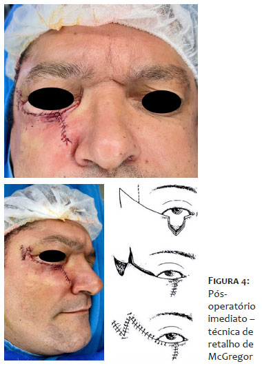 A partir disso, foi planejado o tratamento cirúrgico. Após a exérese da lesão com margem de segurança de 5 mm, a ferida operatória passou a incluir a pálpebra inferior, motivo pelo qual se optou pela reconstrução com retalho de McGregor (Figura 3). A técnica consiste em uma incisão lateral que acompanha a curvatura da pálpebra, podendo estender-se até a região anterior à linha de implantação capilar pré-auricular, de acordo com a largura do defeito a ser coberto. No caso do paciente deste relato, não foi necessário prolongar a incisão principal. A curvatura da incisão é essencial para conferir um comprimento vertical adequado ao retalho.