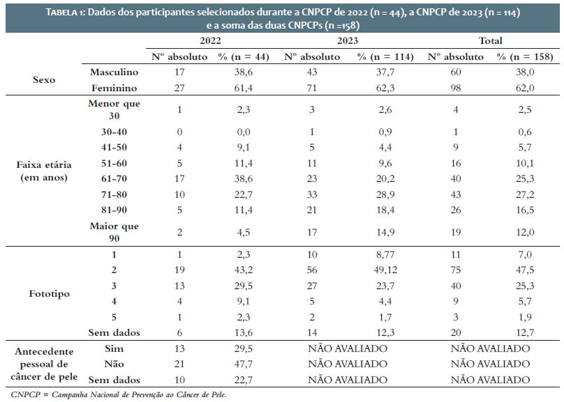 Trata-se de um estudo transversal analítico retrospectivo, com características descritivo-quantitativas. Foi realizado por meio da análise de fichas coletadas na CNPCP, no ambulatório do Serviço de Dermatologia da Faculdade de Medicina de Jundiaí (FMJ), Jundiaí, São Paulo. O tamanho da amostra correspondeu ao número máximo de participantes que os pesquisadores conseguiram abordar durante a CNPCP nos anos de 2022 e 2023, e que se enquadraram nos critérios de inclusão, resultando em um total de 158 pessoas. Foram incluídos na pesquisa todos os pacientes com idade igual ou superior a 18 anos, além daqueles que apresentavam suspeita de diagnóstico de câncer de pele, avaliada pelos dermatologistas da FMJ. Foram excluídos os participantes que não concordaram com os termos do Termo de Consentimento Livre e Esclarecido. Esta pesquisa foi submetida à avaliação do Comitê de Ética em Pesquisa (CEP) da FMJ. Uma vez obtida a aprovação do CEP, a análise dos dados provenientes dos questionários preenchidos durante a CNPCP foi iniciada. Os dados obtidos foram organizados em planilhas eletrônicas do software Microsoft Excel® (Microsoft Corporation,® San Diego, USA). A análise estatística foi realizada por meio do plugin StatPlus® (AnalystSoft Inc.) para Excel, sendo os dados numéricos apresentados como média e respectivo desvio-padrão, além de mediana e intervalo interquartil (IIQ). A comparação entre os anos de 2022 e 2023 foi realizada por meio do teste U de Mann-Whitney. O valor de significância adotado foi de 5%.