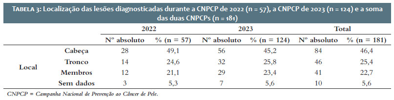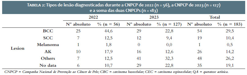 No tocante ao tipo de lesão de pele encontrado no exame dermatológico, em 2022, a maior parte das lesões era composta por CBC, com 25 casos (44,6%), seguida por queratose actínica (QA), com 10 casos (17,8%), e por CEC, com sete casos (12,5%). As lesões pigmentadas, sugestivas de melanoma, corresponderam a um caso (1,7%). Vale destacar que, como alguns pacientes apresentavam mais de uma lesão, o número total de lesões é superior ao número de participantes. Em 2023, a maior parcela foi composta por lesões não neoplásicas, totalizando 41 casos (32,3%), seguida por CBC, com 29 lesões (22,8%), e por CEC, com 12 casos (9,4%). Nesse mesmo ano, não foi diagnosticada nenhuma lesão pigmentada sugestiva de melanoma (Tabela 2).