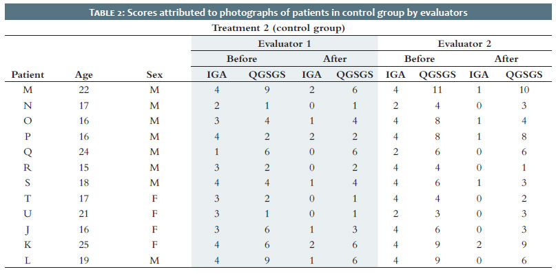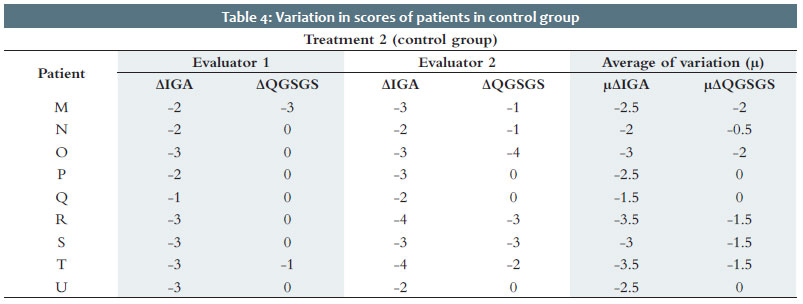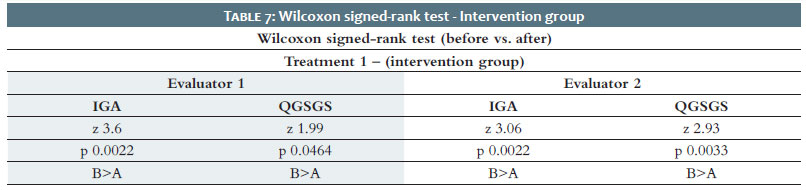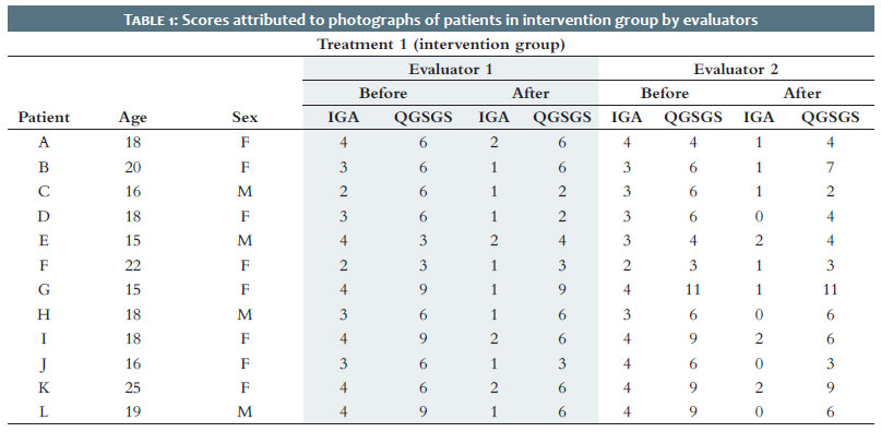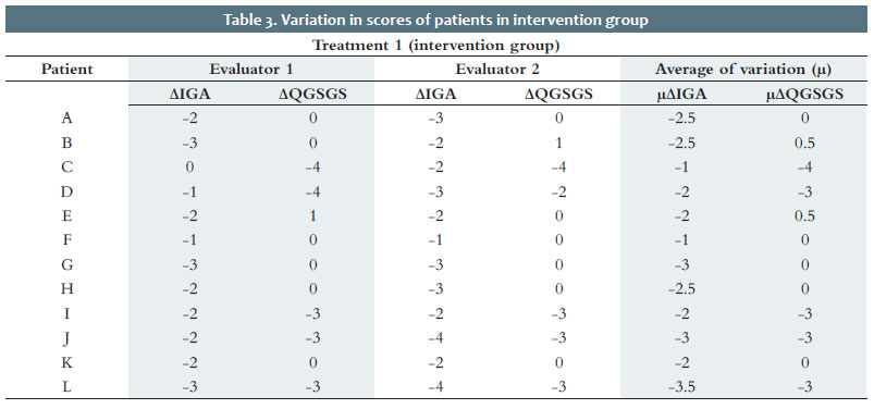 The QGSGS and IGA scales were applied to photographs taken of each patient at the beginning of treatment and upon completion. Assessments were performed by blinded evaluators, two dermatologists who did not take part in the intervention stages and were not informed about to which group each patient had been assigned. Scores were then analyzed statistically to compare patients in the intervention and control groups. The Mann–Whitney test24 was used to compare variables between intervention and control groups, and the Wilcoxon signed-rank test24 to compare the periods before and after treatment.