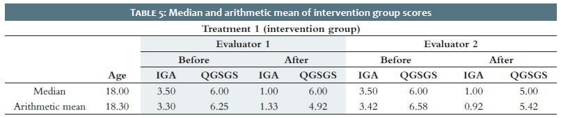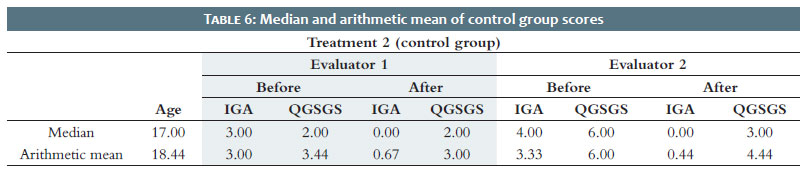 A preliminary analysis indicated that most scores had neutral or negative results. This means there was a decrease in the number of lesions (measured by IGA) and scars (measured by QGSGS) for both intervention and control group patients. Exceptionally, Patient E showed an increase in QGSGS assigned by Evaluator 1, and Patient B showed an increase in QGSGS assigned by Evaluator 2. A possible explanation for the increases in QGSGS for these two outliers is that active acne lesions may interfere with the initial assessment of preexisting scars, leading to an artificially low initial QGSGS score. The median and arithmetic mean of scores are shown in Table 5 and Table 6.