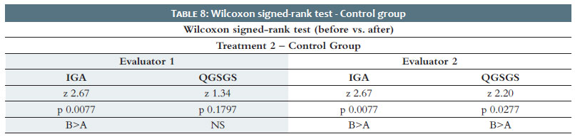 The scores for before and after photographs for both groups as assessed using the IGA and QGSGS scales by the evaluators (Evaluator 1 and Evaluator 2) can be found in Table 1 and Table 2.