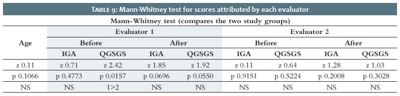 The test showed that IGA and QGSGS values were higher before treatment than after for both groups and for both evaluators, with statistical significance, except for QGSGS in the control group according to Evaluator 1. The data confirm the expected hypothesis that both treatments promoted improvements in skin quality for patients, resulting in fewer acne lesions (measured by IGA) and fewer scars (measured by QGSGS). Although this outcome was anticipated, it is worth emphasizing that the peels were not harmful to patients and may have had a neutral or beneficial effect. The Mann-Whitney test was also applied, resulting in the comparative analysis shown in Table 9.