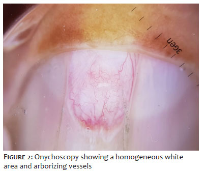 Physical examination revealed a nail plate with canaliform dystrophy and a subungual lesion located at the lunula (Figure 1). On onychoscopy, a homogeneous white area and arborizing vessels were observed (Figure 2). The diagnostic hypotheses considered were fibrokeratoma and superficial acral fibromyxoma.