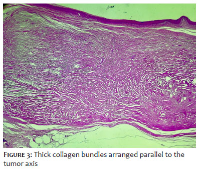 The histology of ADFK shows acanthotic epidermis, hyperkeratosis, and focal thickening of the granular layer. In the dermis, thick collagen bundles are observed, arranged irregularly or parallel to the tumor axis. Elastic fibers are generally thin and sparse, and the dermis is usually highly vascularized.1,9