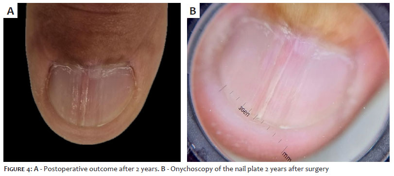 Surgical treatment is recommended, particularly in the presence of pain or cosmetic impairment, since the tumor does not tend to regress spontaneously.4,5 Complete surgical excision is the treatment of choice, as partial removal is frequently associated with local recurrence.2,5 The lesion should be dissected back to its most proximal origin in the nail unit and excised at that site to prevent recurrence.8 To avoid further damage to the nail matrix and ensure complete tumor removal, Jahan et al.3 recommend careful elevation of the lesion and retraction of the proximal nail fold, which allows better visualization of the structures during surgery. Lesions located above the nail plate may also be removed by shaving followed by phenolization or CO2 laser vaporization.3,4 Electrosurgery and cryosurgery have also been reported as alternative treatment options by some authors.10,11