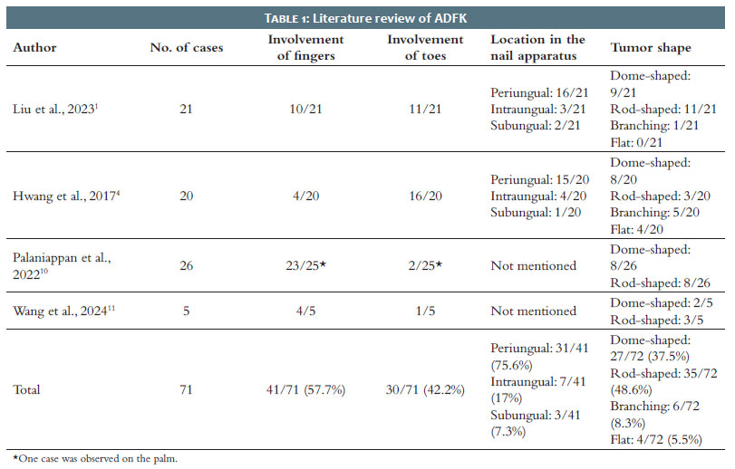 ADFK usually arises from the proximal nail fold or, less commonly, from the nail matrix or bed. In a study involving 20 participants, subungual lesions were observed in only 1 patient.4 Another study, with 21 Chinese patients, identified subungual lesions in only 2 cases.1 When compiling three case series, we observed that 56% of patients presented with lesions on the fingers and 44% on the toes (Table 1).