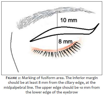 a) With the patient in horizontal supine position and eyes closed, a fusiform marking of the skin to be excised was made using a surgical marking pen or methylene blue. The lower limit was drawn at a distance greater than 8 mm from the lash line, and the upper limit of the fusiform area was marked more than 10 mm from the lower edge of the eyebrow (measures adopted to avoid lagophthalmos).1 At the lateral ends, a slight arching was performed. (Figure 2)