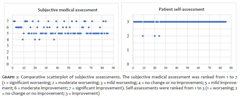 For dermatologists, a subjective assessment of mild improvement (52.9%) predominated over all other findings (47.2%) (p = 0.665). Comparing rates of improvement vs. non-improvement, the post-blepharoplasty outcome was significant (94.3 vs. 4.7%; p = 0.001). In patient self-assessments, however, a significant improvement was found (96.5 vs. 3.5%; p = 0.001). Graph 2 shows the assessments of dermatologists and patients.