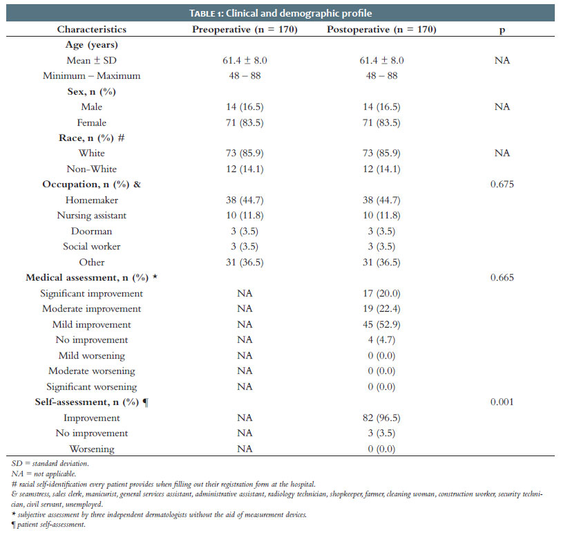 The eyelids are complex structures with specific functions, such as protecting the eyeball from trauma, shielding it from excessive light, and executing movements towards the tear drainage system, in addition to contributing to the eye's beauty and expression.1,2 Some factors, primarily chronological skin aging, may lead to loss of elasticity and excess upper eyelid skin (upper dermatochalasis), causing visual impairment and impacting periocular aesthetics.3 Lower dermatochalasis has greater impact on cosmetic appearance.4 Laser and radiofrequency may be used to treat dermatochalasis,5 but a surgical procedure (blepharoplasty) is still the most widely used technique, given its low cost and low invasiveness.3 Traditionally, ophthalmology and plastic surgery are the two medical specialties that perform blepharoplasties.3,4,6 However, given the current public health care scenario, both specialties are in high demand, leading to extremely long waiting lists for blepharoplasty. Dermatology, as a medical-surgical specialty, can also perform the procedure, and having dermatologists perform blepharoplasties is an alternative to help reduce waiting times.7 In addition, it would be important to assess whether dermatology is able to achieve satisfactory postoperative outcomes. However, considering the subjective assessment of primary surgeons themselves alone would be suboptimal, and including the assessment of other physicians, combined with objective evaluation, would lower potential performance biases.3,6 A previous study proposed assessing the surgical outcomes of upper blepharoplasty performed by dermatologists objectively by comparing pre- and postoperative measures of palpebral fissure height (PFH).3 However, that study had a limited sample size (only nine patients) and suggested additional studies should be conducted.3 The aim of the present study was to determine if there was any improvement in dermatochalasis after upper blepharoplasty performed by a local dermatology service, thus investigating the qualification of that specialty to perform the procedure. The improvement was assessed both quantitatively, by comparing pre- and postoperative PFH measures, and qualitatively, based on the pre- and postoperative subjective assessments by independent dermatologists and the patients themselves.