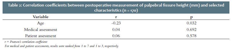 Regarding PFH correlations after blepharoplasty, there was an inverse correlation with patient age (r = -0.230; p = 0.032). Dermatologists' assessments and patient self-assessments were not significantly correlated with post-blepharoplasty PFH (p > 0.05) (Table 2). However, comparing dermatologists' assessments to patient self-assessments (disregarding PFH measurements), the result was statistically significant (r = 0.351; p < 0.001).