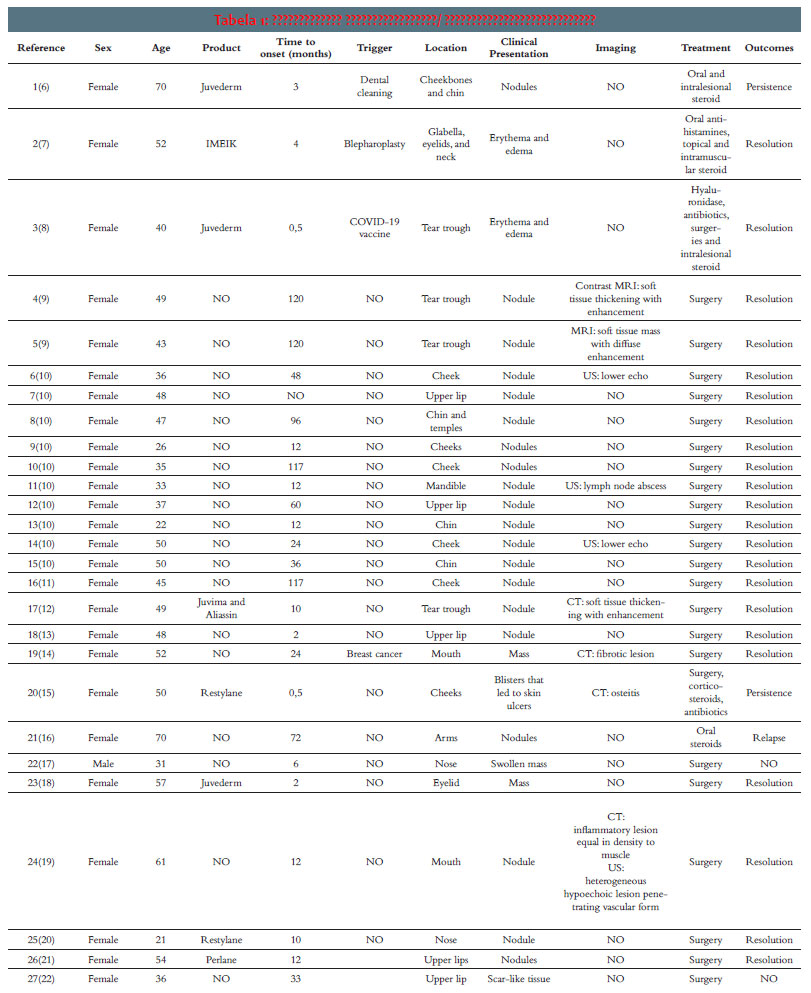 How to cite this article: Osorio Cock LM, Rengifo Palacios JA, Uribe Posada MP, Sarabia de Capozzi MA, Angulo Morillo MA. Advances in evaluation and management of hyaluronic acid-induced foreign body granulomas: a systematic review. Surg Cosmet Dermatol. 2025;17;e20250457.