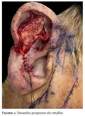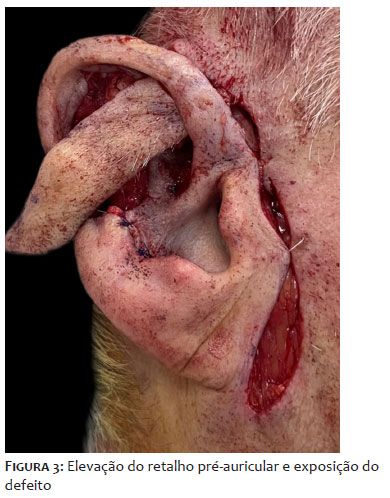 Em seguida, foi planejado um retalho de transposição pré-auricular ipsilateral de base superior, seguindo as linhas naturais da pele. A dissecção do retalho foi iniciada distalmente e avançou em direção ascendente até o nível do ramo da hélice. Foi realizada uma incisão ao longo do teto da hélice, criando um túnel sob ela. O túnel foi dimensionado cuidadosamente para corresponder à largura e espessura do retalho. A porção do retalho através do túnel foi desepitelizada. A seguir, o retalho pré-auricular foi conduzido através do túnel, posicionado sobre o defeito no enxerto de cartilagem e fixado com suturas de Prolene 4-0. O defeito secundário na área pré-auricular foi fechado com suturas de Vicryl 4-0 e Prolene 5-0.