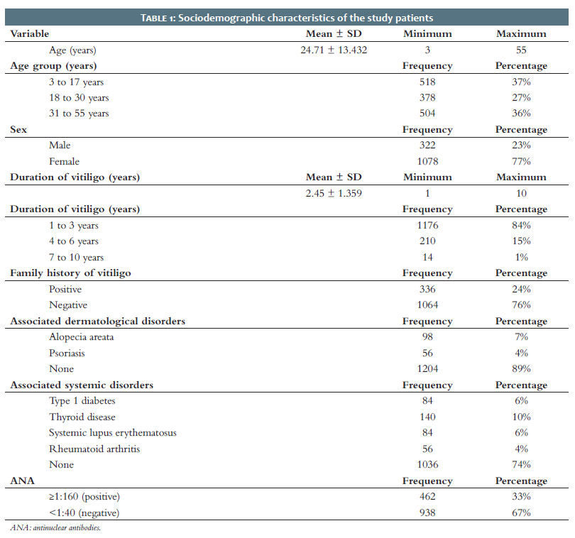 This study included 1400 patients diagnosed with vitiligo. The mean age of patients was 24.71 (13.432) years, ranging from 3 to 55 years. By age group, 37% of patients were 3–17 years old, 27% were 18–30 years old, and 36% were 31–55 years old. Most participants were female (77%), with males comprising 23% of the total. Mean disease duration was 2.45 (1.359) years, ranging from 1 to 10 years. Disease duration was distributed as follows: 84% of patients had vitiligo for 1 to 3 years, 15% for 4 to 6 years, and only 1% for 7 to 10 years. Positive family history was reported by 24% of patients, whereas 76% had no family history. In terms of associated dermatological disorders, 7% of patients reported having alopecia areata (AA) and 4% had psoriasis. However, 89% of patients had no associated dermatological disorders. In addition, 6% had type 1 diabetes mellitus (DM), 10% had thyroid disease (TD), 6% had SLE, and 4% had rheumatoid arthritis (RA), while 74% had no associated systemic disorders. Finally, 33% were positive for ANA and 67% were negative (Table 1).