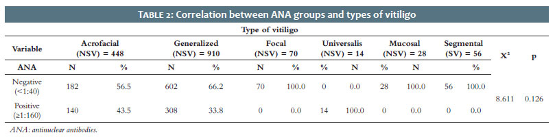 Many different types of connective tissue diseases typically have positive ANA levels, and laboratory tests are often used to screen for systemic lupus erythematosus (SLE) and other connective tissue diseases due to their extremely high sensitivity but low specificity.7 There is debate over whether to check ANA levels in patients with vitiligo. According to a recent meta-analysis, the prevalence of ANA is higher among patients with vitiligo compared to the general population.8 As an autoimmune condition involving T lymphocytes, ANA positivity may be highly prevalent among patients with vitiligo. The objective of this study was to assess antinuclear antibody levels and their relationship with the severity of different types of vitiligo.