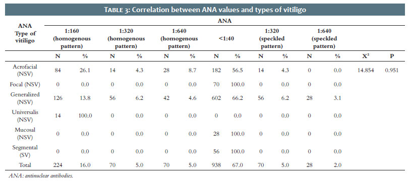 A weak positive correlation was found between ANA values and types of vitiligo (χ2 = 14.573, p = 0.951). The acrofacial (NSV) and generalized (NSV) forms were the most frequent types of vitiligo in relation to ANA levels (Table 3).