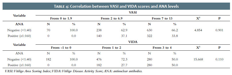 The identification and characterization of antinuclear autoantibodies in patients with vitiligo are vital indicators that support the findings of previous research indicating vitiligo is an autoimmune disease and may help pave the way for determining the potential incidence of other autoimmune conditions.27 The present study found a weak positive correlation between ANA positivity and VASI scores, with 37.1% and 33.8% ANA-positive for VASI scores from 2 to 7 and for more than 7 to 13, respectively; similar to the findings of Chivu et al. (2022).9 There was a weak positive correlation between ANA positivity and different types of vitiligo, with 35% for the acrofacial (NSV) form and 33.8% for the generalized (NSV) form. This is in line with the findings of Ekhlas et al. (2023),27 but higher than the findings of Kasumagic-Halilovic et al. (2013),28 who detected ANA in 17% of patients with vitiligo; the difference may be due to the larger sample size in the present study.