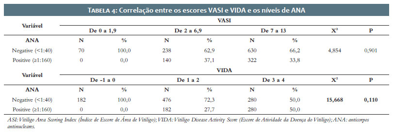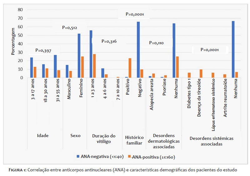 CONCLUSÕES: Foi observada uma correlação significativa entre positividade para ANA e histórico familiar de vitiligo e doenças autoimunes sistêmicas, como diabetes mellitus tipo 1 e doenças da tireoide. Correlações positivas fracas foram encontradas entre ANA e diferentes tipos de vitiligo e escores de gravidade da doença.
