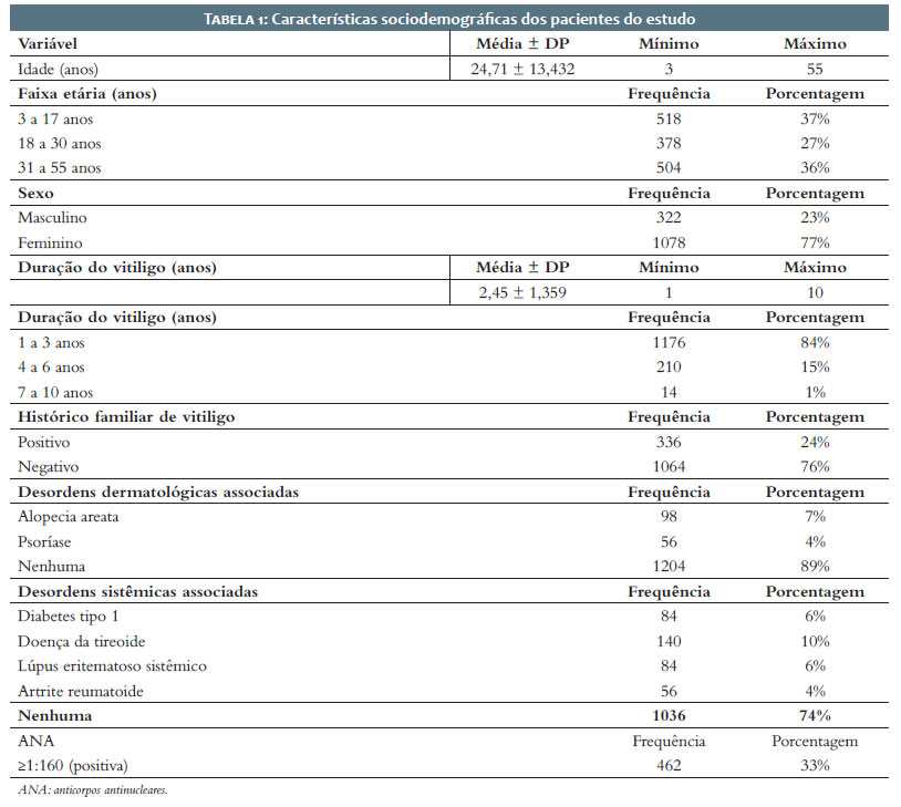 O estudo incluiu 1400 pacientes diagnosticados com vitiligo. A média de idade dos pacientes foi de 24,71 anos (13,432), variando de 3 a 55 anos. Por faixa etária, 37% dos pacientes tinham entre 3 e 17 anos, 27% tinham entre 18 e 30 anos e 36% tinham entre 31 e 55 anos. A maioria dos participantes era do sexo feminino (77%), enquanto os pacientes do sexo masculino representavam 23% do total. A duração média da doença foi de 2,45 anos (1,359), variando entre 1 e 10 anos. A duração da doença teve a seguinte distribuição: 84% dos pacientes apresentavam vitiligo há 1 a 3 anos, 15% há 4 a 6 anos e apenas 1% há 7 a 10 anos. Um histórico familiar positivo de vitiligo foi informado por 24% dos pacientes, enquanto 76% não possuíam histórico familiar da doença. Em relação a desordens dermatológicas associadas, 7% dos pacientes informaram ter alopecia areata (AA) e 4% tinham psoríase. Contudo, 89% dos pacientes não tinham desordens dermatológicas associadas. Além disso, 6% tinham diabetes mellitus (DM) tipo 1, 10% tinham doença da tireoide (DT), 6% tinham LES e 4% tinham artrite reumatoide (AR), enquanto 74% não tinham desordens sistêmicas associadas. Por fim, 33% eram positivos para ANA e 67% eram negativos (Tabela 1).