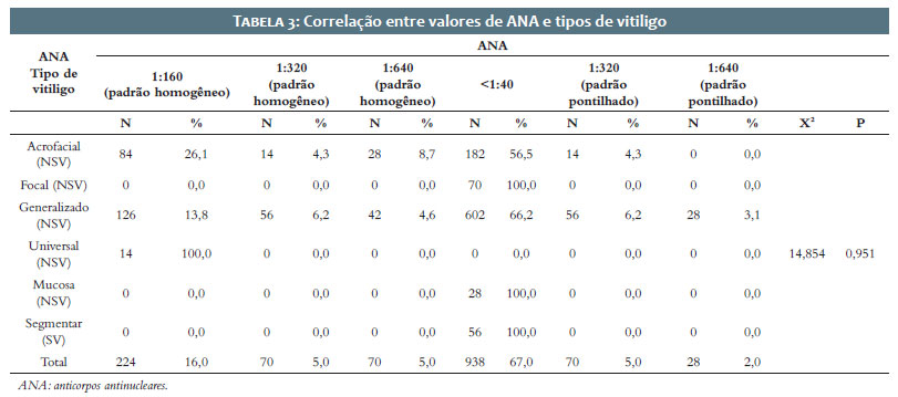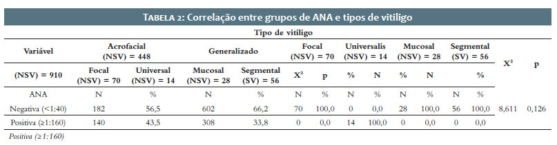 Foi observada uma correlação positiva fraca entre valores de ANA e diferentes tipos de vitiligo. A ANA negativa <1:40 foi mais frequente entre todos os tipos de vitiligo, exceto o vitiligo universal (Tabela 2).