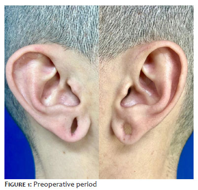 The patient, a 29-year old male with no comorbidities, sought specialized care in order to correct deformities in both earlobes caused by prolonged use of gauges, with gradual increase in size since adolescence. Clinical presentation included earlobes with large-diameter orifices and irregular margins, as well as bilateral asymmetry, making repair an aesthetic challenge (Figure 1). After careful assessment, bilateral lobuloplasty using the innovative inverted "snail" technique was indicated. The technique was chosen due to its capacity to recreate the natural contour of the earlobe, minimizing visible scars and restoring symmetry. In an outpatient setting, the procedure began with marking the skin around the circumference of the stretched branch of the earlobe (Figure 2A), with specific points on the medial and lateral regions. After asepsis and antisepsis, local infiltration using a modified Klein solution was performed, providing adequate anesthesia and vasoconstriction. Next, the stretched branch was sectioned at its lateral portion (Figure 2B), resulting in a longer medial flap and a shorter lateral flap (Figure 2C). To ensure harmonization of the new earlobes, scarification was carried out on the inner surface of the whole lateral flap and on the outer surface of the medial flap, preserving part of the outer surface of the lateral flap to form the lower border of the new lobe. The medial flap was then folded over its own axis, taking on a spiral shape—the "snail"—and joined to the raw areas of both flaps. Stabilization was achieved with simple stitches using 4-0 Vicryl sutures between the scarified areas, followed by a continuous 5-0 nylon suture along the entire length for skin closure (Figure 2D). In the postoperative period, the patient progressed favorably, with no complications, pain, or signs of infection (Figure 3). Proper healing was observed, along with a satisfactory aesthetic outcome, featuring symmetrical earlobes and a harmonious contour, in contrast to the asymmetries and deformities observed previously (Figure 4).
