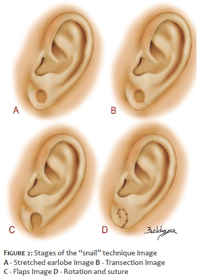 Earlobe stretching dates back to various ancient cultures. In Ancient Egypt, for instance, Pharaoh Tutankhamun wore ear gauges, a common practice among elites symbolizing status and power.1 In Africa, tribes such as the Maasai in Kenya and the Mursi in Ethiopia practice earlobe stretching to this day, with gauge size associated with age, wisdom, and how respected an individual is in their community. Earlobe stretching also has spiritual significance among some tribes in South America and indigenous peoples of Asia, who believe the practice opens "gateways" or "connections" with the spirit world.2 In the modern Western world, gauges rose in popularity in the 1970s and 1980s as part of counterculture movements, and became consolidated as a form of self-expression associated with alternative groups and subcultures during the 1990s and 2000s. Earlobe stretching came to be seen as a form of body modification connected to individuality and self-expression, untethered from tradition and part of the modern urban context.3 Although gauges have historically been used in many cultures to symbolize social status, cultural identity, and spirituality, prolonged use can cause earlobe deformities, which may in turn require surgical correction. The search for approaches that ensure aesthetic and functional results while preserving natural earlobe anatomy and promoting discreet scars has encouraged the development of new repair techniques. In this case report, we describe the use of the inverted "snail" technique for the reconstruction of bilateral earlobes deformed by prolonged use of gauges. It differs from the technique as previously described in terms of the transection site of the enlarged branch of the lobe.4