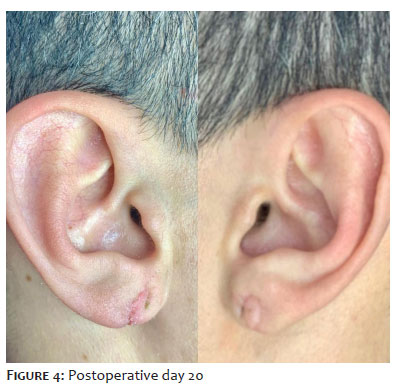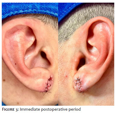 How to cite this article: Pires Júnior LRDB, Fujii FN, Castilho R, Lescowicz WRA, Leite RB, Engelhorn AVV. Bilateral lobuloplasty with inverted "snail" technique for correction of lobes deformed by prolonged use of gauges. Surg Cosmet Dermatol. 2025;17:e20250418.