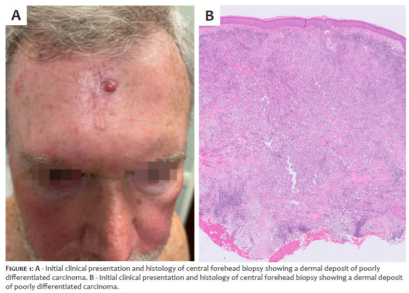 Previous biopsies from the sites of concern found moderately well-differentiated squamous cell carcinoma. Biopsies obtained during the current visit revealed dermal deposition of poorly differentiated cutaneous squamous cell carcinoma extending to deep and peripheral margins. Special stains were positive for P63 and CD10 and negative for desmin and SOX-10 (Figure 1A and 1B).