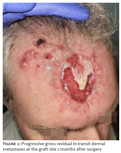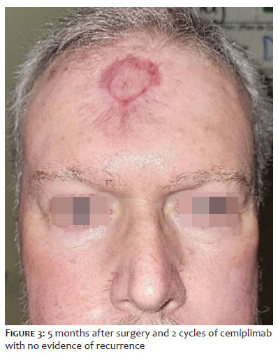 In addition, the central forehead lesion had special stains positive for CK903, P40/CK 5/6, GATA-3, and PAX-8. The patient was diagnosed with recurrent locally aggressive cutaneous squamous cell carcinoma (T1N0M0) induced by post-transplant immunosuppressive therapy. He subsequently underwent excisional salvage therapy and local flap reconstruction. The postoperative course was complicated by skin graft wound healing and deterioration. Bacterial cultures grew Serratia marcescens resistant to augmentin, and the patient completed a course of Bactrim with concurrent wound debridement. The patient was found to have progressive gross residual in-transit dermal metastases at the graft site, for which cemiplimab was initiated (Figure 2). Initiation of cemiplimab required discontinuation of tacrolimus and initiation of sirolimus. The patient received two cycles of cemiplimab. Unfortunately, the patient presented to the emergency department with graft rejection secondary to cemiplimab. The patient was placed on hemodialysis and cemiplimab was discontinued. A recent PET-CT scan revealed no obviously evaluable disease. The patient had no clinical signs of recurrence at his most recent follow-up visit (Figure 3).