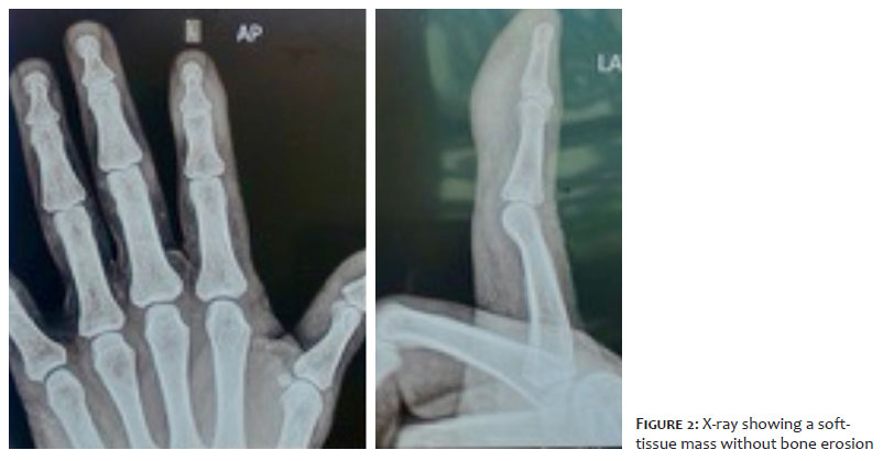 A 52-year-old woman presented to the Dermatology outpatient service with discomfort in her left index finger and an enlarging mass for 3 years. On physical examination, there was a tender nodule 2 × 2 cm on size at the volar aspect of the left index finger involving the distal phalanx (Figure 1). The nodule was ill-defined from the surrounding tissue and not associated with paresthesia. Movement of the distal interphalangeal joint was mildly restricted. The patient had no history of smoking or alcohol abuse. Family history was also not relevant. X-ray imaging showed a soft-tissue mass without bone erosion (Figure 2).