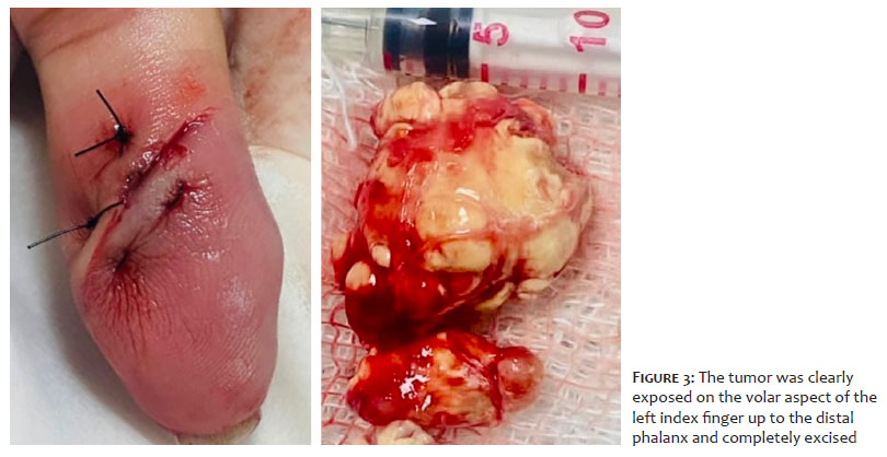 Postoperative follow-up was performed one month after the procedure. The patient made a full recovery without movement restriction or substantial swelling (Figure 5). Flexion at the distal interphalangeal joint of the left index finger was normal. No clinical or radiologic signs of recurrence were observed at follow-up 3 months after the excision.