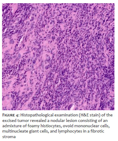 After discussing treatment options with the patient, surgical excision was planned. A linear incision was made over the mass under 2% lidocaine infiltration. The tumor was clearly exposed on the volar aspect of the left index finger up to the distal phalanx and completely excised (Figure 3). Primary closure of the surgical wound was performed. Histopathological examination of the excised tumor revealed a nodular lesion consisting of an admixture of foamy histiocytes, ovoid mononuclear cells, multinucleate giant cells, and lymphocytes in a fibrotic stroma. Numerous vessels of varying calibers were present. Scattered hemosiderin deposition was noted. Mitotic activity was readily observed (Figure 4).