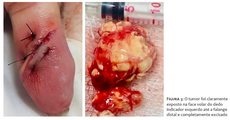 O seguimento pós-operatório foi realizado um mês após o procedimento. A paciente teve recuperação completa, sem restrição de movimento ou edema considerável (Figura 5). A flexão da articulação interfalângica distal do dedo indicador esquerdo estava normal. Nenhum sinal clínico ou radiológico de recidiva foi observado no seguimento 3 meses após a excisão.