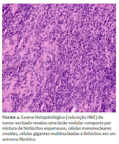 Após conversar com a paciente sobre as opções terapêuticas, indicou-se a excisão cirúrgica. Foi realizada uma incisão linear sobre a massa sob infiltração de lidocaína a 2%. O tumor foi claramente exposto na face volar do dedo indicador esquerdo até a falange distal e completamente excisado (Figura 3). O fechamento primário da ferida operatória foi realizado. O exame histopatológico do tumor excisado revelou uma lesão nodular composta por uma mistura de histiócitos espumosos, células mononucleares ovoides, células gigantes multinucleadas e linfócitos em um estroma fibrótico. Numerosos vasos de calibres variados estavam presentes. Observou-se deposição dispersa de hemossiderina. A atividade mitótica era evidente (Figura 4).