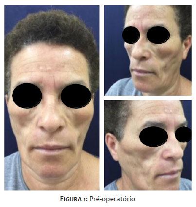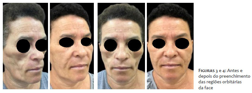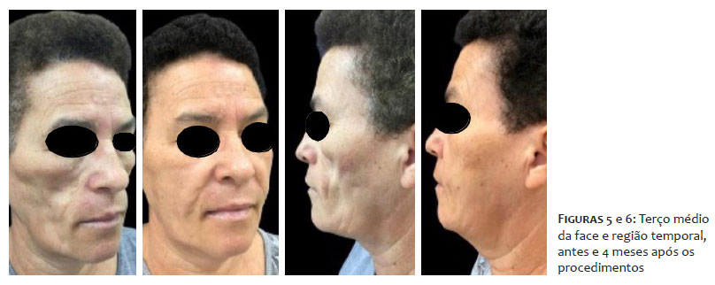 Nas figuras 5 e 6, correspondentes ao pós-operatório de 4 meses, observa-se uma perda de preenchimento no terço médio de face e na região temporal, com perda parcial de volume enxertado. No entanto, as linhas e depressões faciais claramente são menores em comparação às imagens do pré-operatório.