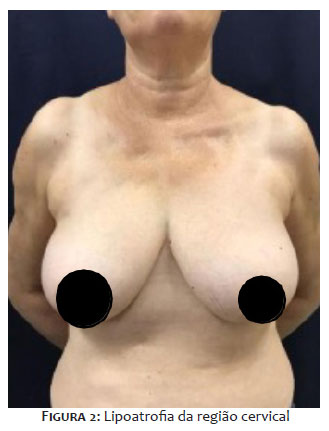 A paciente apresentava lipoatrofia da região cervical, terço superior do tórax e região proximal dos membros superiores, sem acometimento de região abdominal, conforme mostra a figura 2.