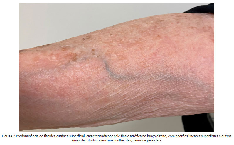Com o envelhecimento, a epiderme e a derme, responsáveis pelas propriedades mecânicas e pelas forças de contenção da pele, sofrem atrofia progressiva e desorganização arquitetural.5,6 Há uma redução da atividade metabólica dos fibroblastos e da síntese de componentes da matriz extracelular (MEC), como colágeno, fibras elásticas, proteoglicanos e glicosaminoglicanos.7 O envelhecimento também leva ao aumento de espécies reativas de oxigênio e da atividade das metaloproteinases de matriz (MMPs). As MMPs são endopeptidases que degradam as proteínas da MEC, e sua atividade aumentada contribui para a maior fragmentação do colágeno e da elastina.2,7-9 A epiderme envelhecida se torna mais fina, a junção dermoepidérmica se aplaina e a capacidade proliferativa dos queratinócitos basais diminui, levando a derme a perder elasticidade, resistência à tração e hidratação.10 Por consequência, a flacidez cutânea superficial é mais pronunciada em pacientes idosos e em áreas fotoexpostas, como dorso das mãos, pescoço e face.11
