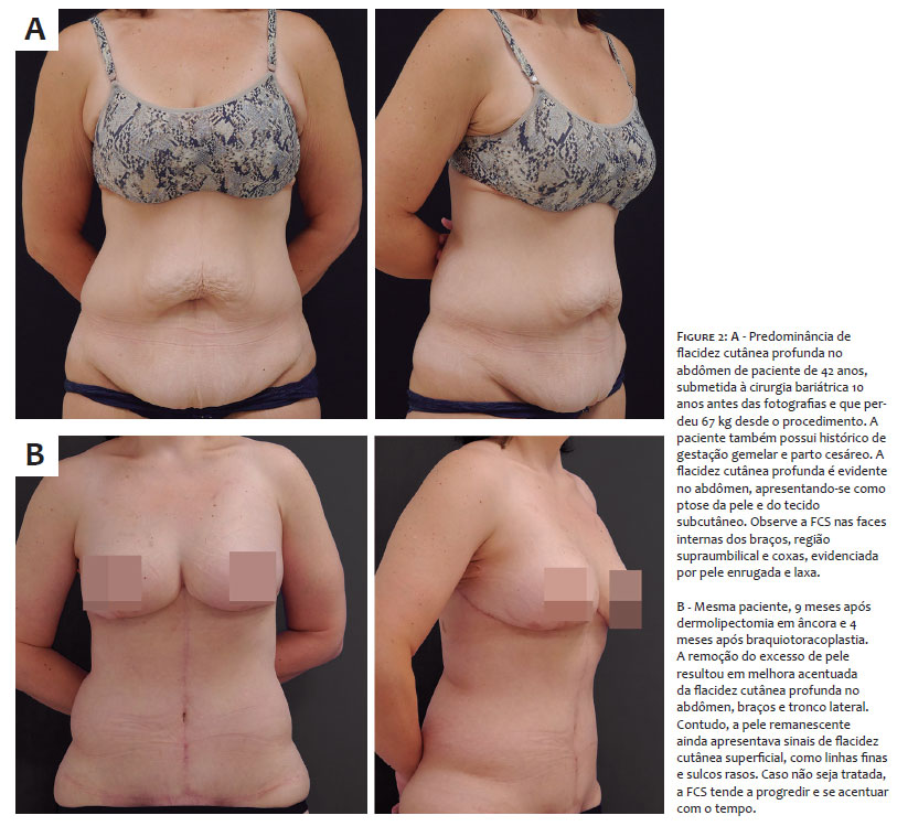 Estudos anteriores sobre flacidez cutânea se concentraram principalmente em um único mecanismo causal. Esta revisão narrativa da literatura analisa as alterações ultraestruturais e anatômicas da pele e do tecido subcutâneo, descrevendo seus diferentes sinais clínicos e propondo alternativas de tratamento específicas para cada tipo de flacidez cutânea. Além disso, este estudo propõe uma nomenclatura operacional baseada na apresentação clínica: flacidez cutânea superficial (FCS) e flacidez cutânea profunda (FCP).