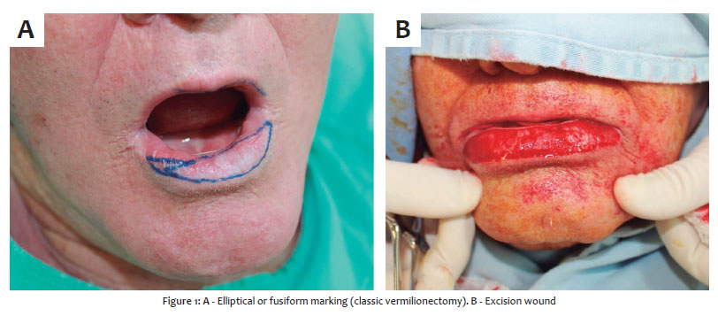 Vermilionectomy is a surgical procedure for the partial or total removal of the vermilion border, used primarily for the treatment of actinic cheilitis. W-plasty has been considered superior to classic elliptical excision because it avoids linear scars and, therefore, lip retractions. However, the classic elliptical excision is still widely used. This article reports two cases treated with both techniques that achieved similar satisfactory aesthetic results.
