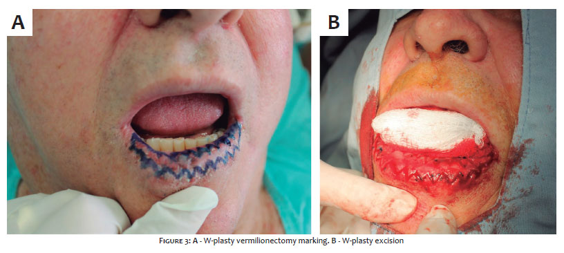 In 2011, Rossoe et al. compared 32 patients treated with the two vermilionectomy techniques (classic vs. W-plasty, 15 and 17 patients, respectively). In that study, W-plasty provided better aesthetic results.4