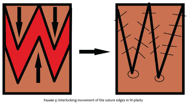 The advantage of the classic technique is that it is easier to perform. Primary linear closure reduces procedure time. In contrast, W-plasty requires interlocking the pointed projections with the corresponding recesses, which demands additional adjustments and extends the surgical time (Figure 5).3,4